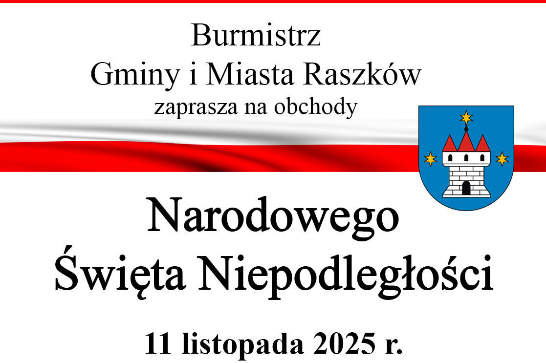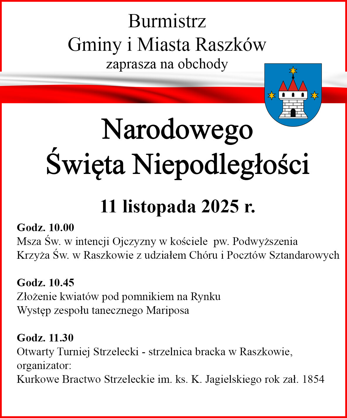 Burmistrz Gminy i Miasta Raszków zaprasza 11 listopada na obchody Narodowego Dnia Niepodległości w Raszkowie.